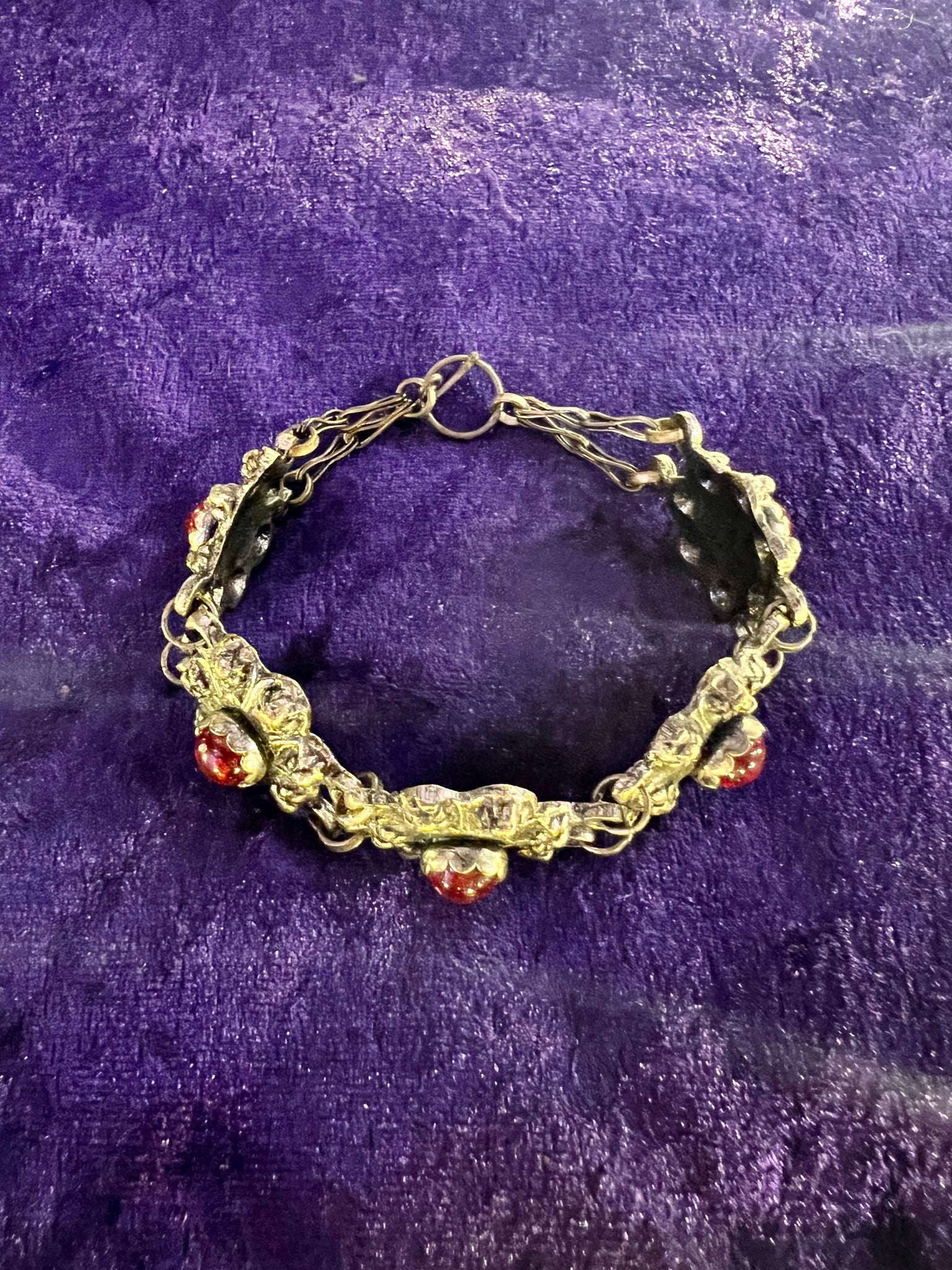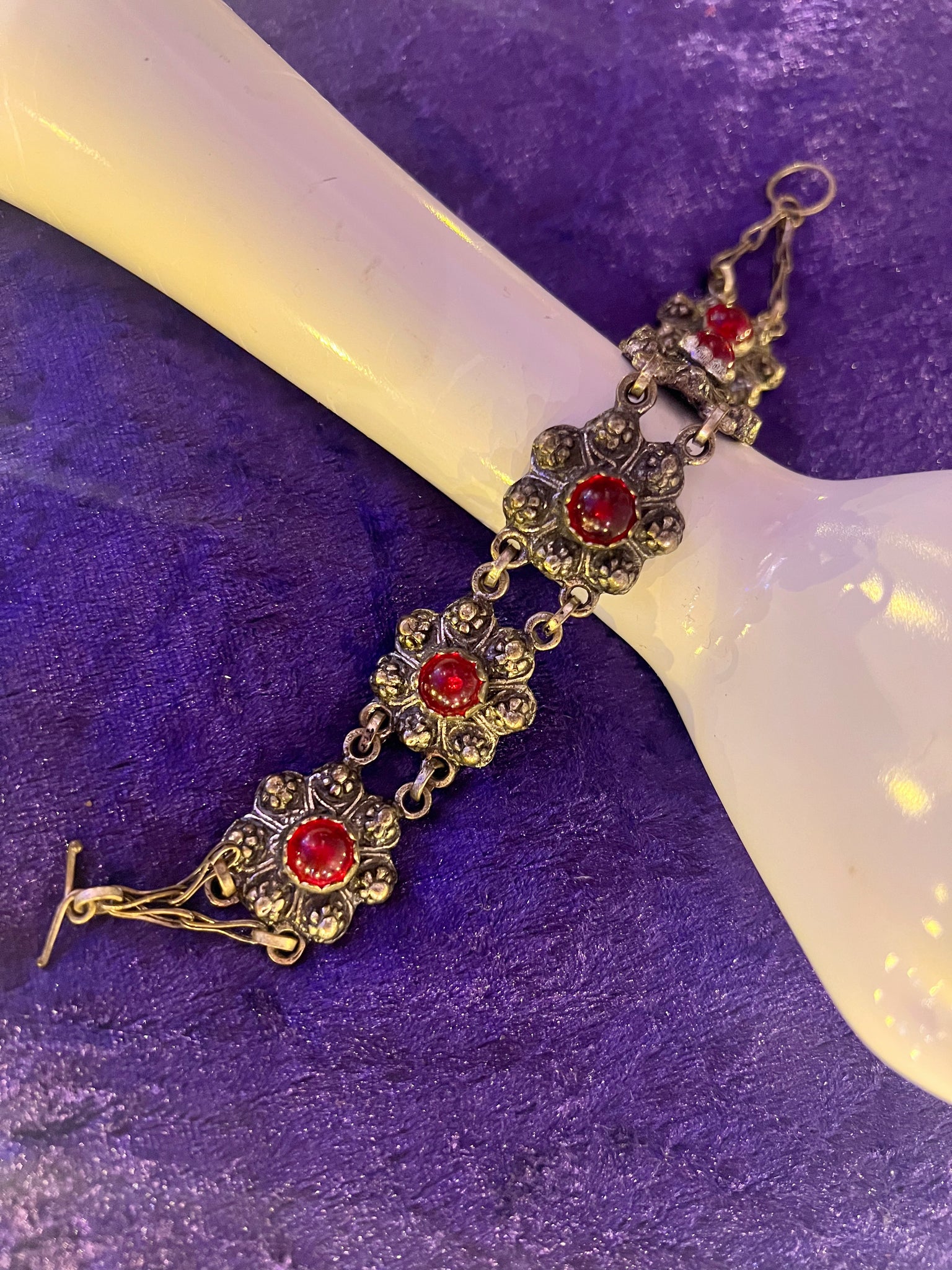 Details- 60s stainless steel Brutalist daisy chain bracelet with red stones
