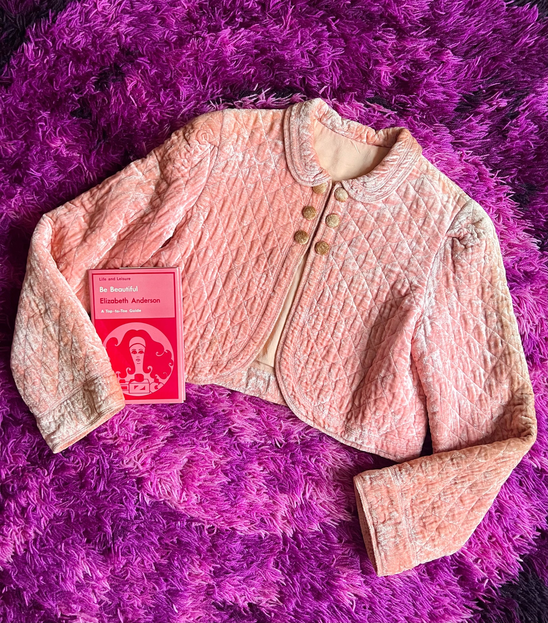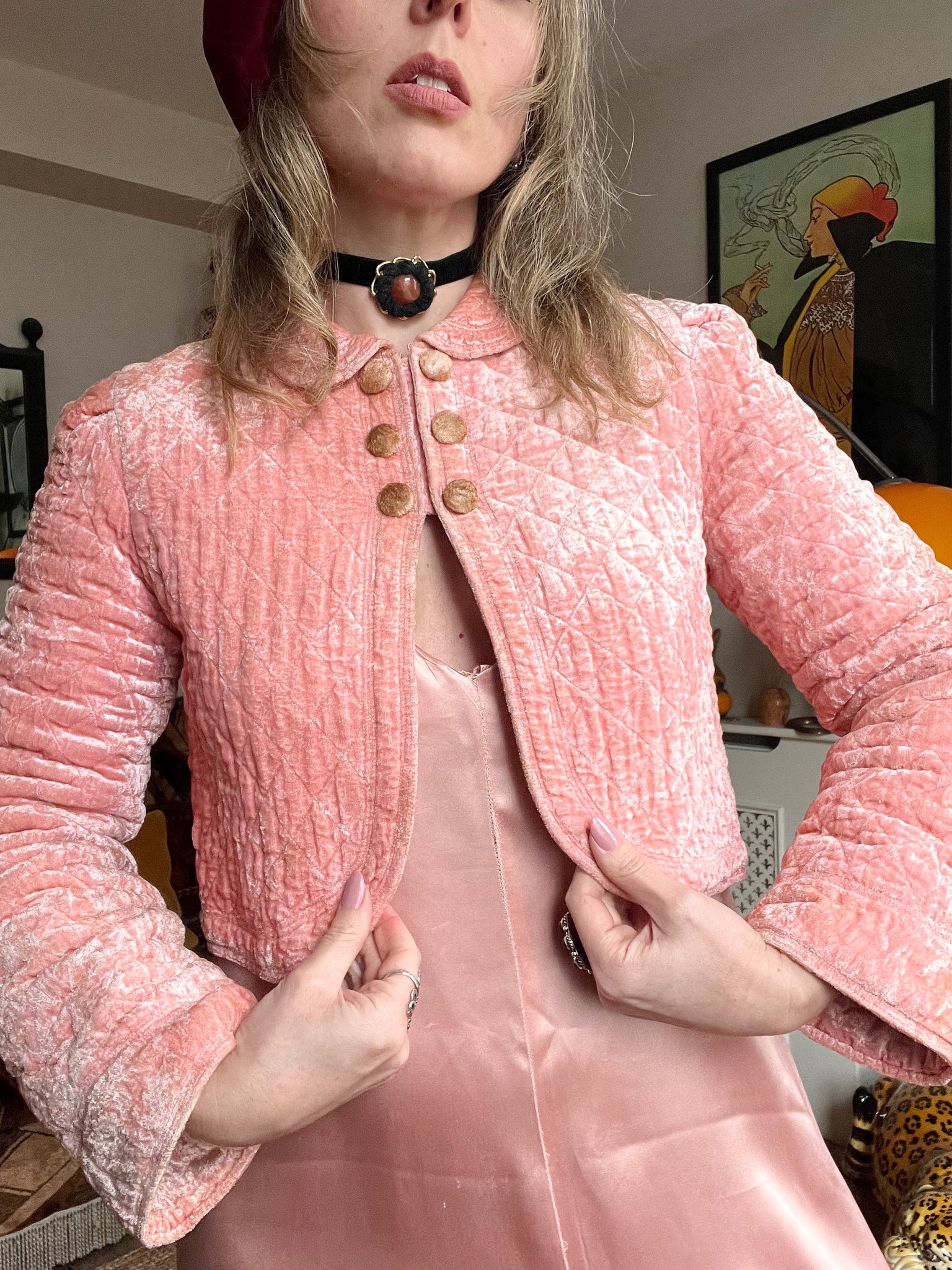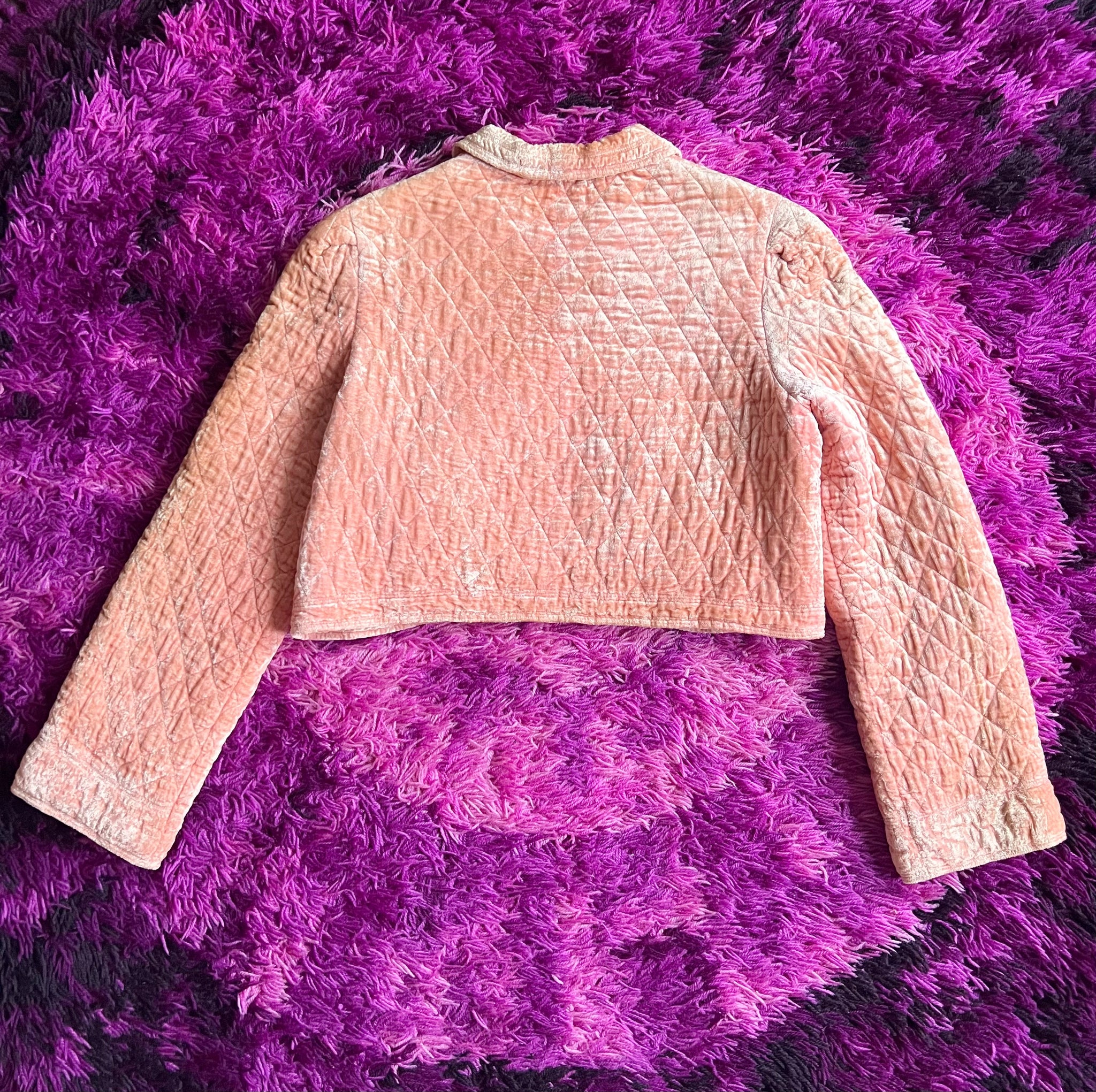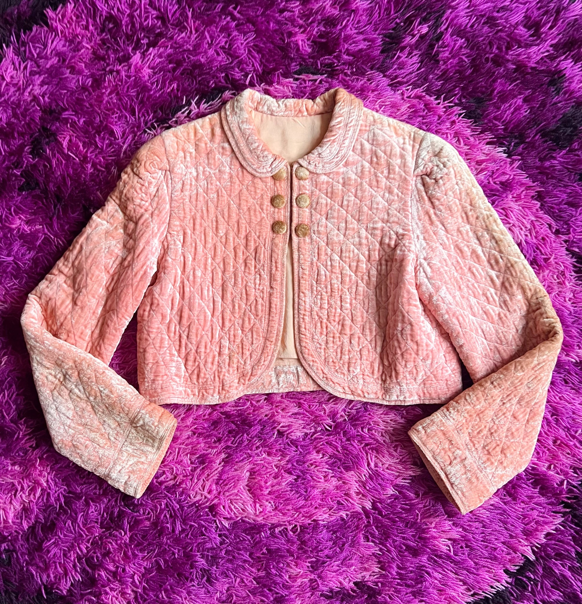 Details- 60s baby pink velvet quilted crop bed jacket with slight bell sleeves