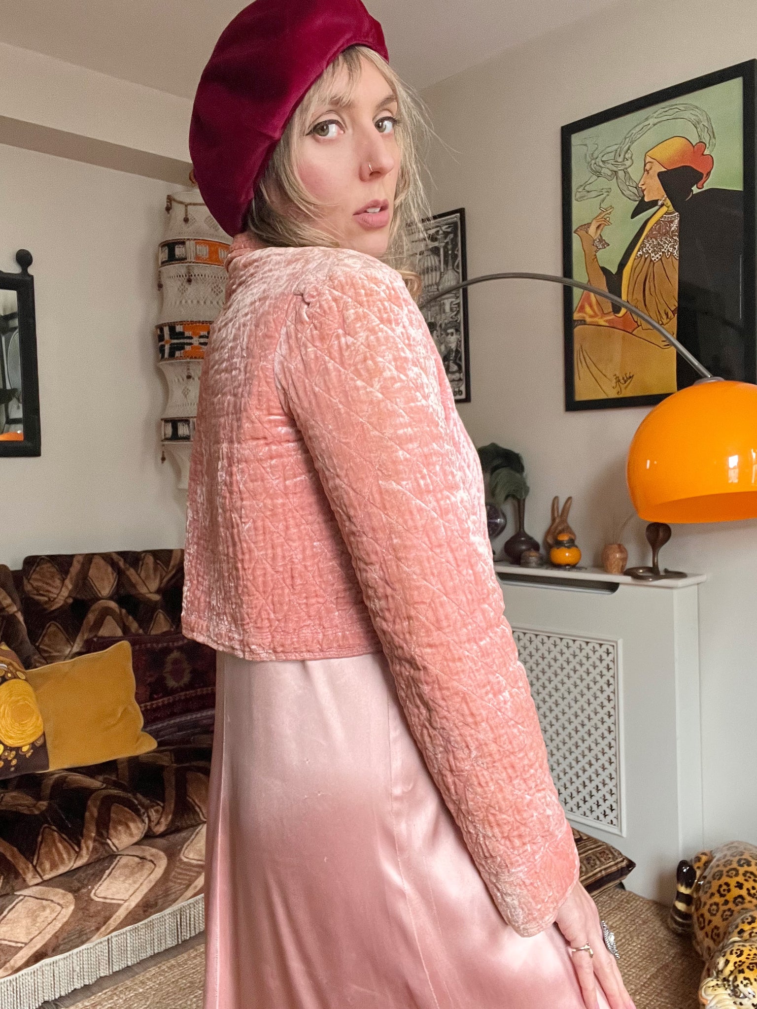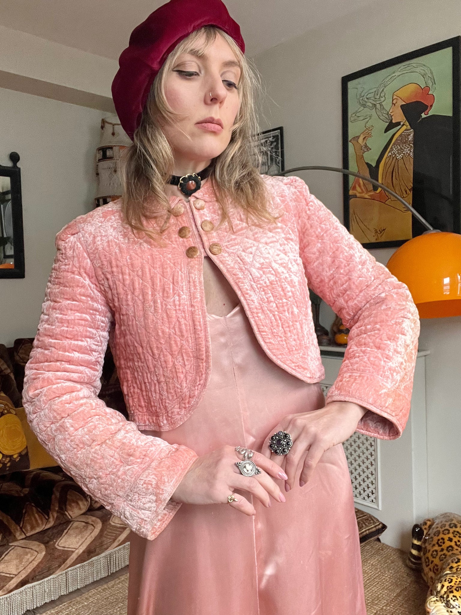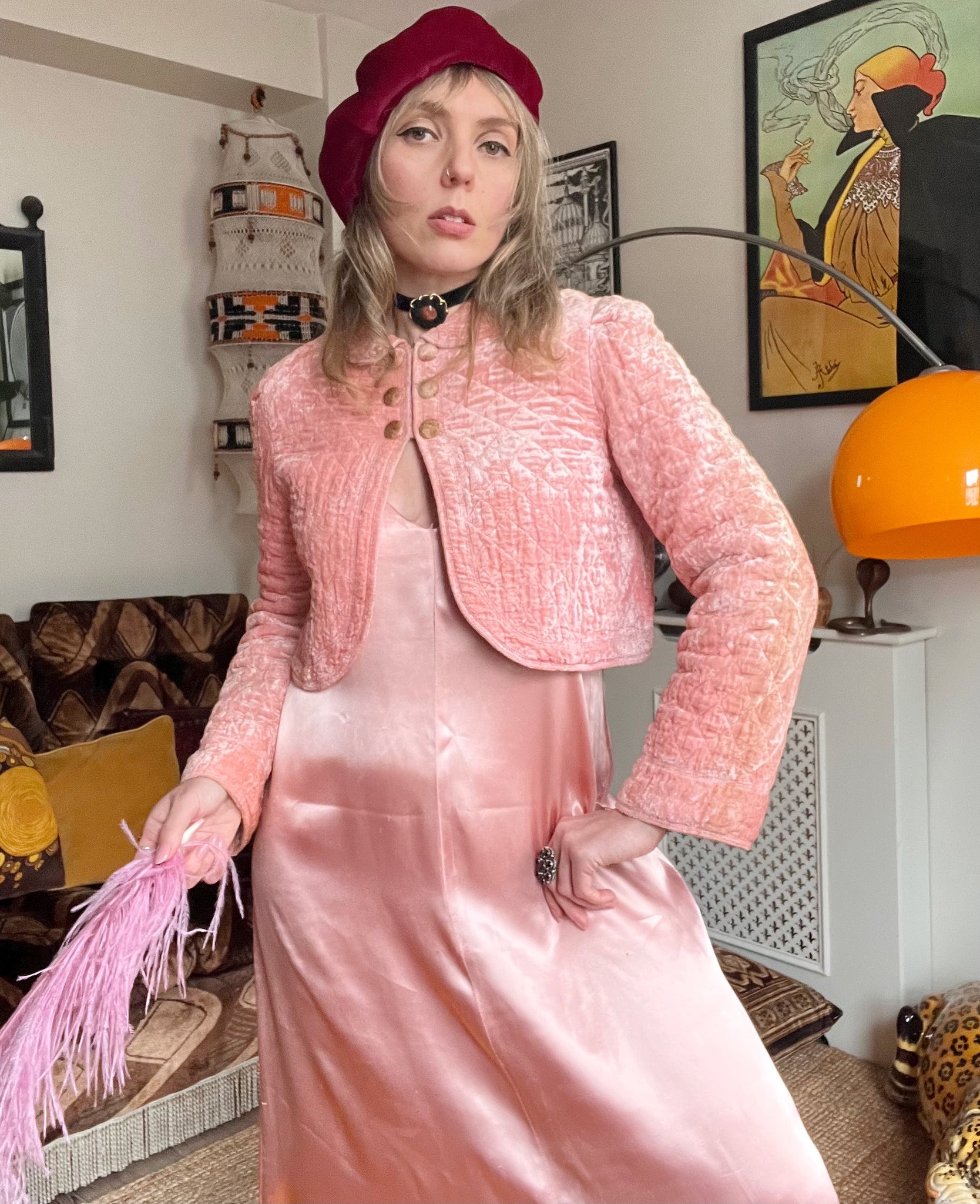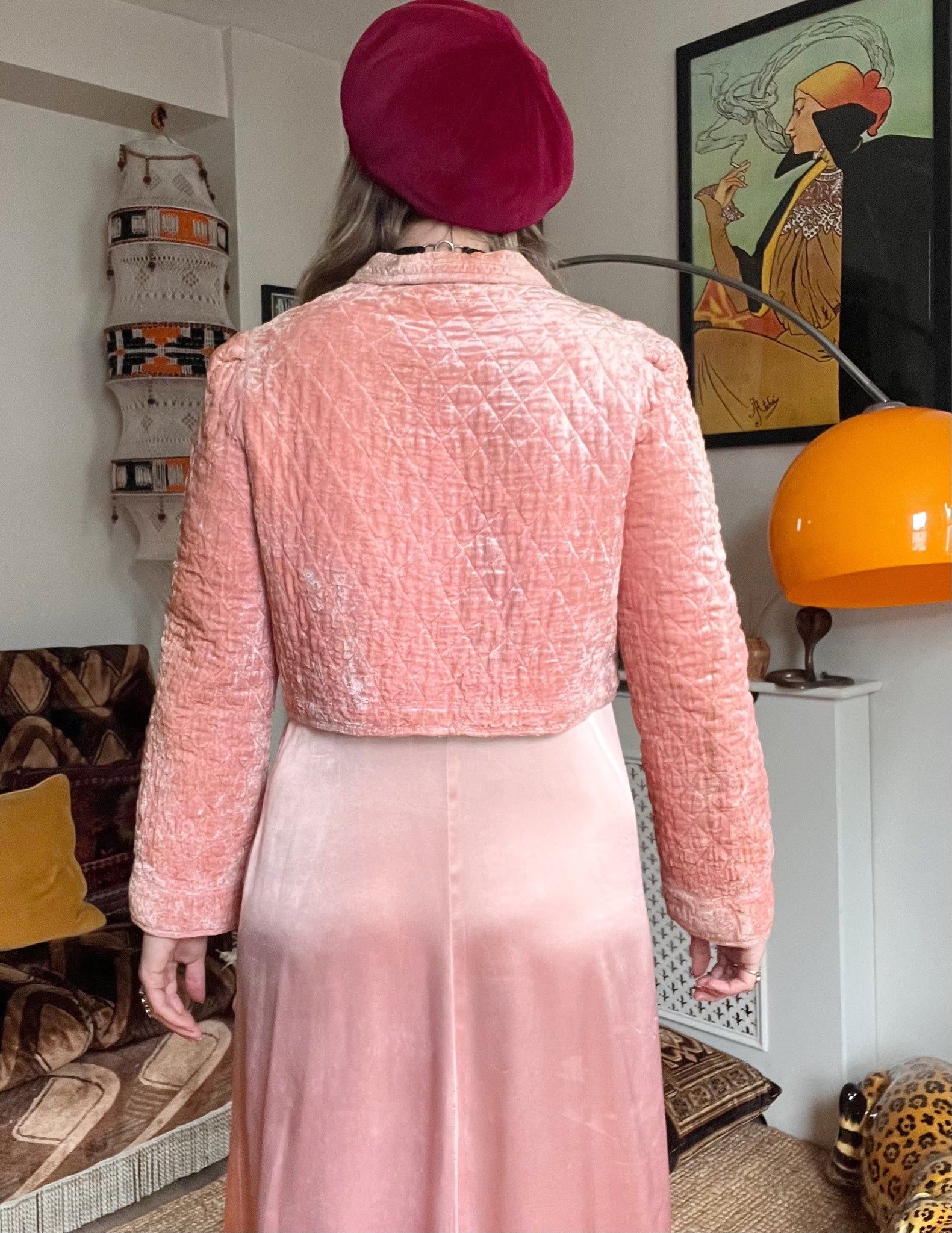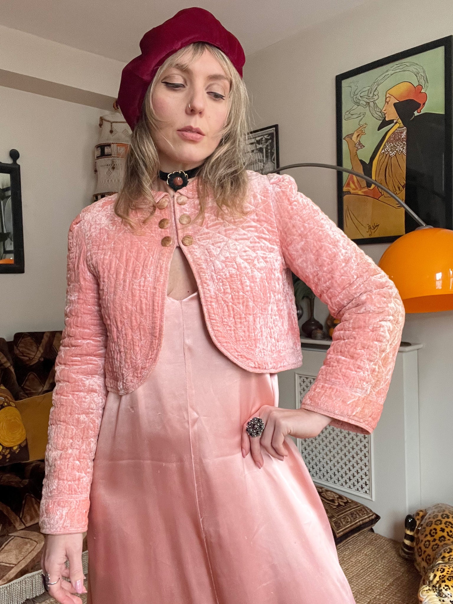Details- 60s baby pink velvet quilted crop bed jacket with slight bell sleeves