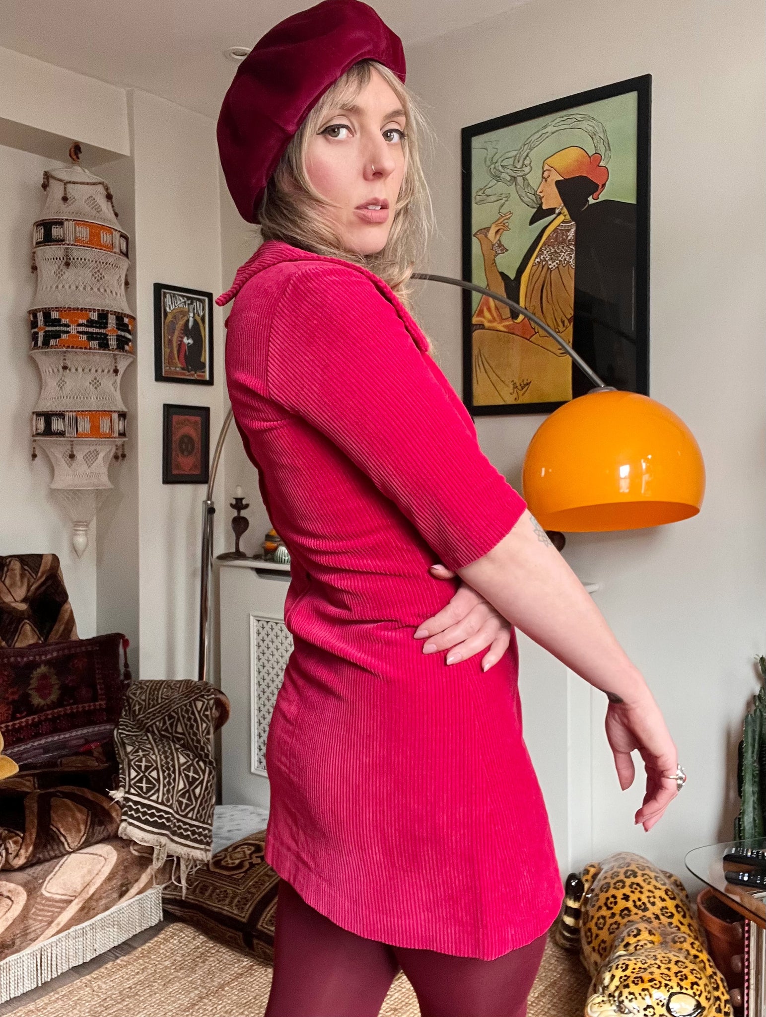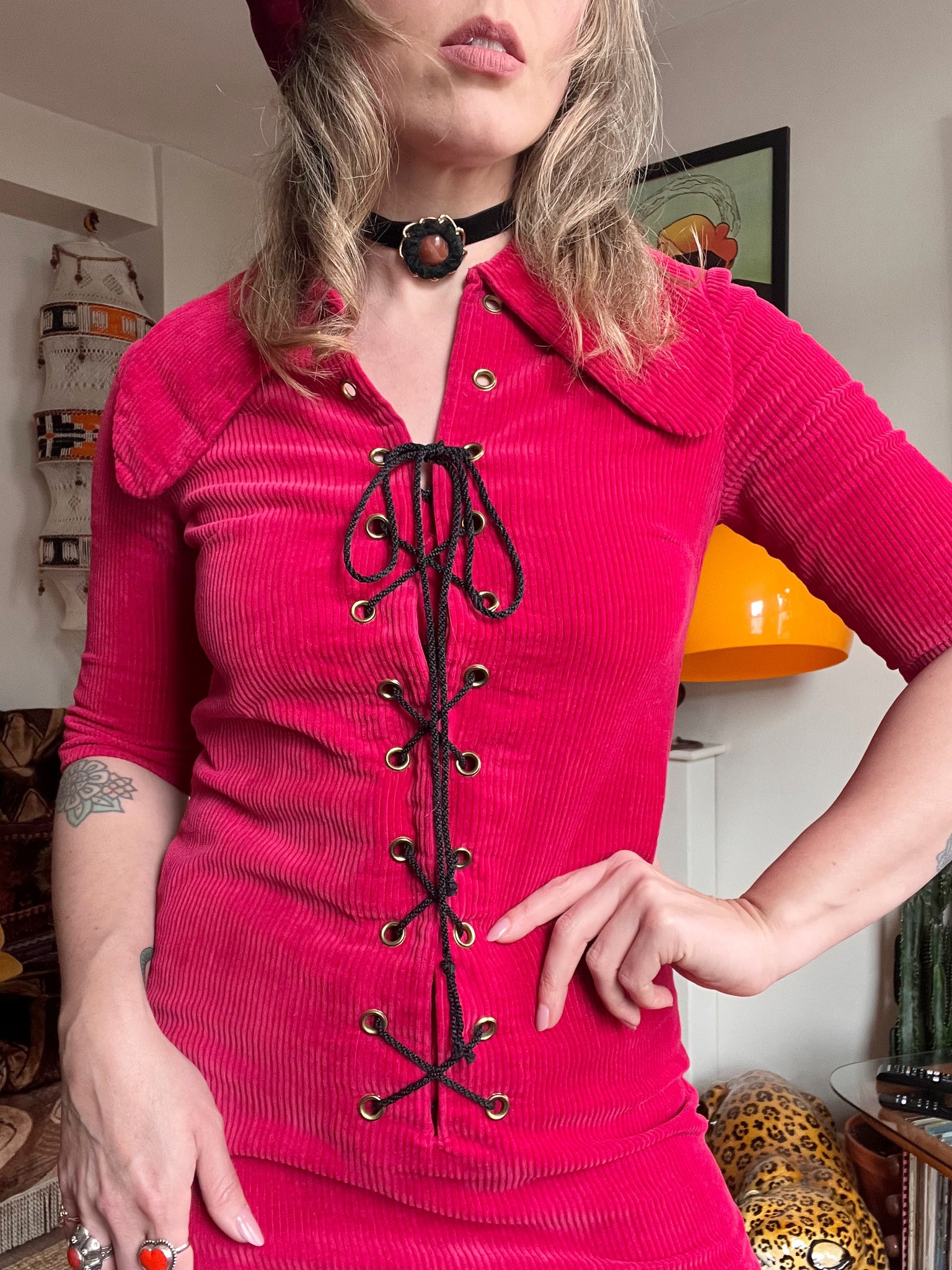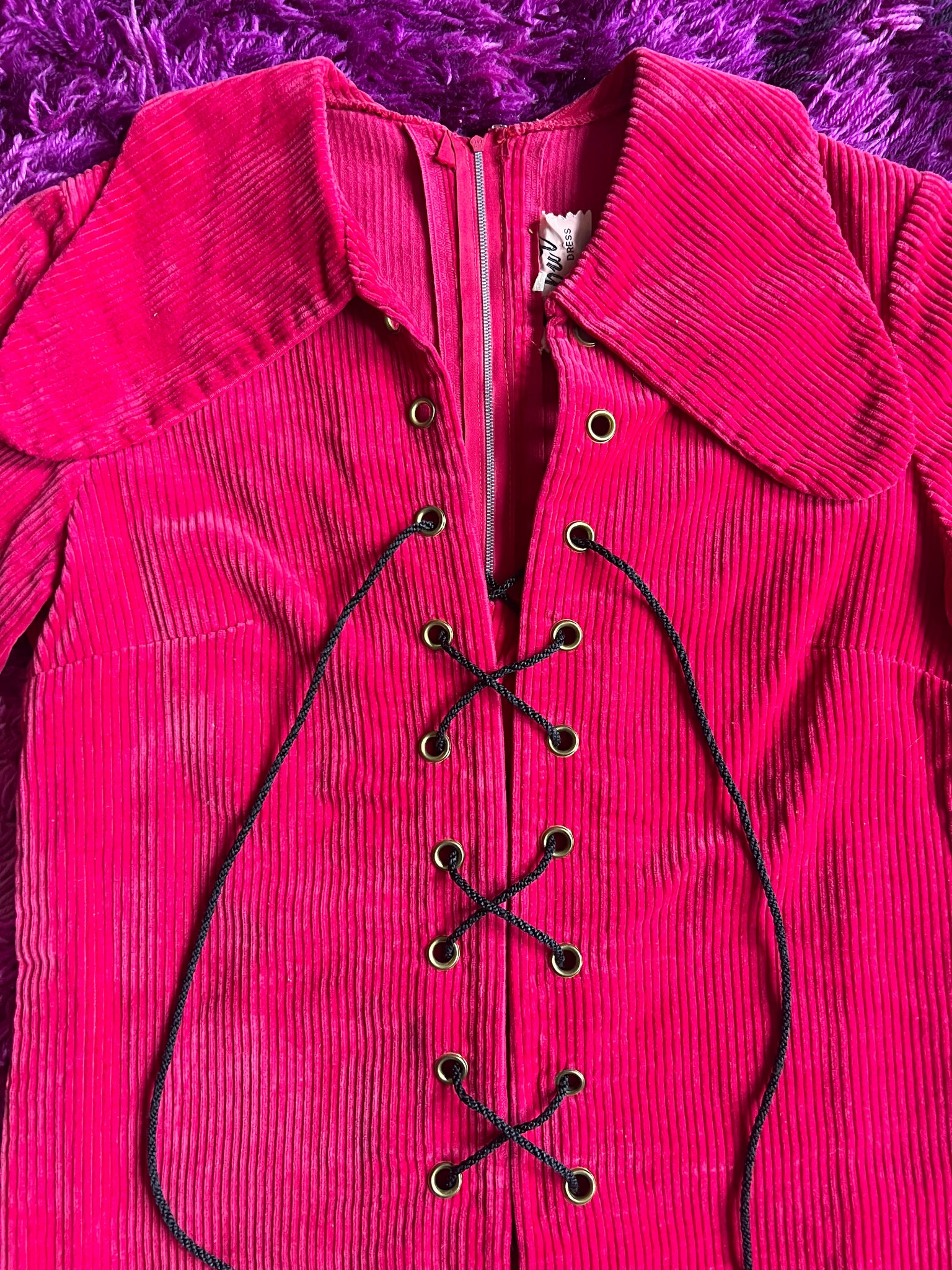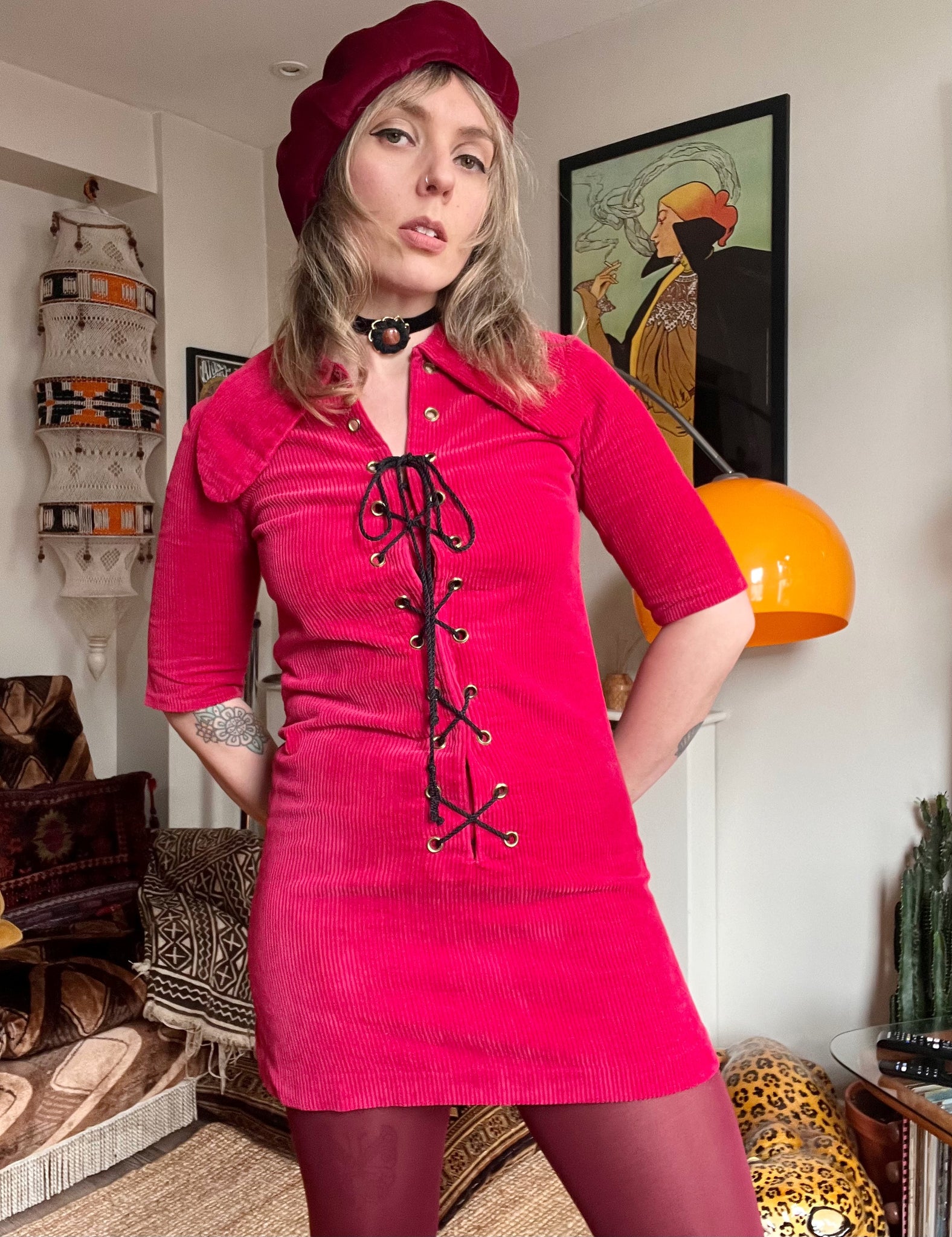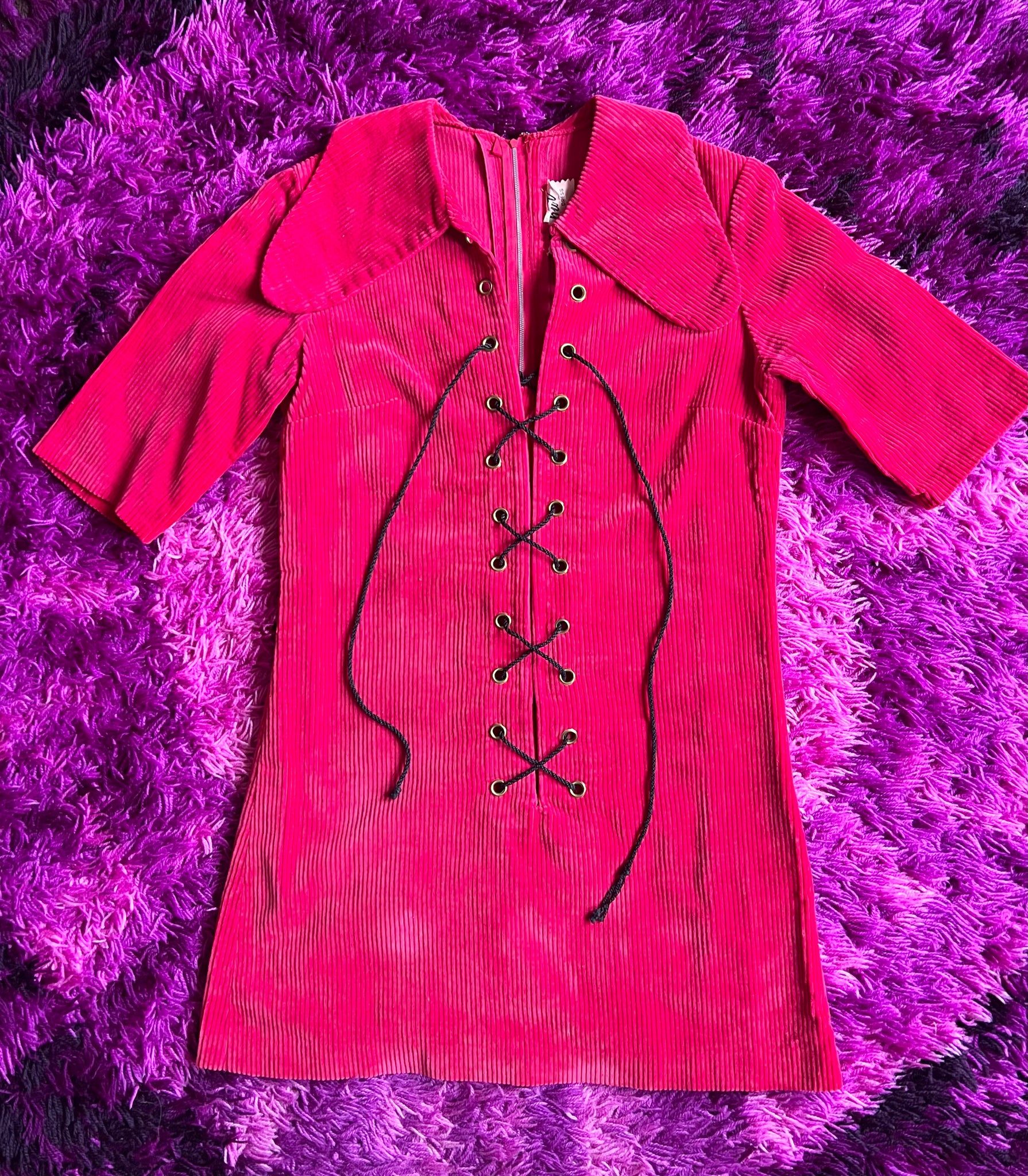 Details- 60s dark pink velvet cord mini dress with short sleeves, large beagle collar and lace up eyelet front