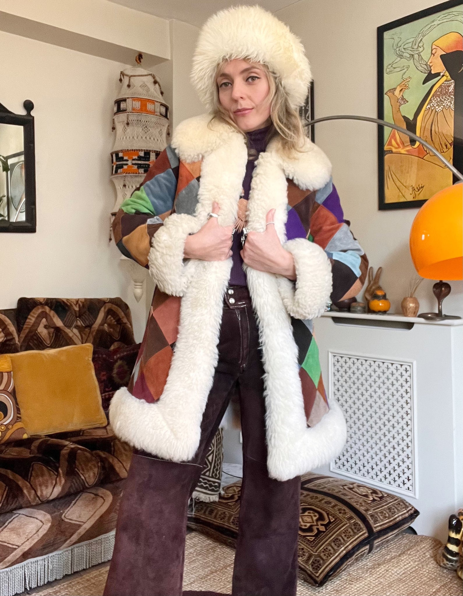 patchwork suede coat with sheepskin trims