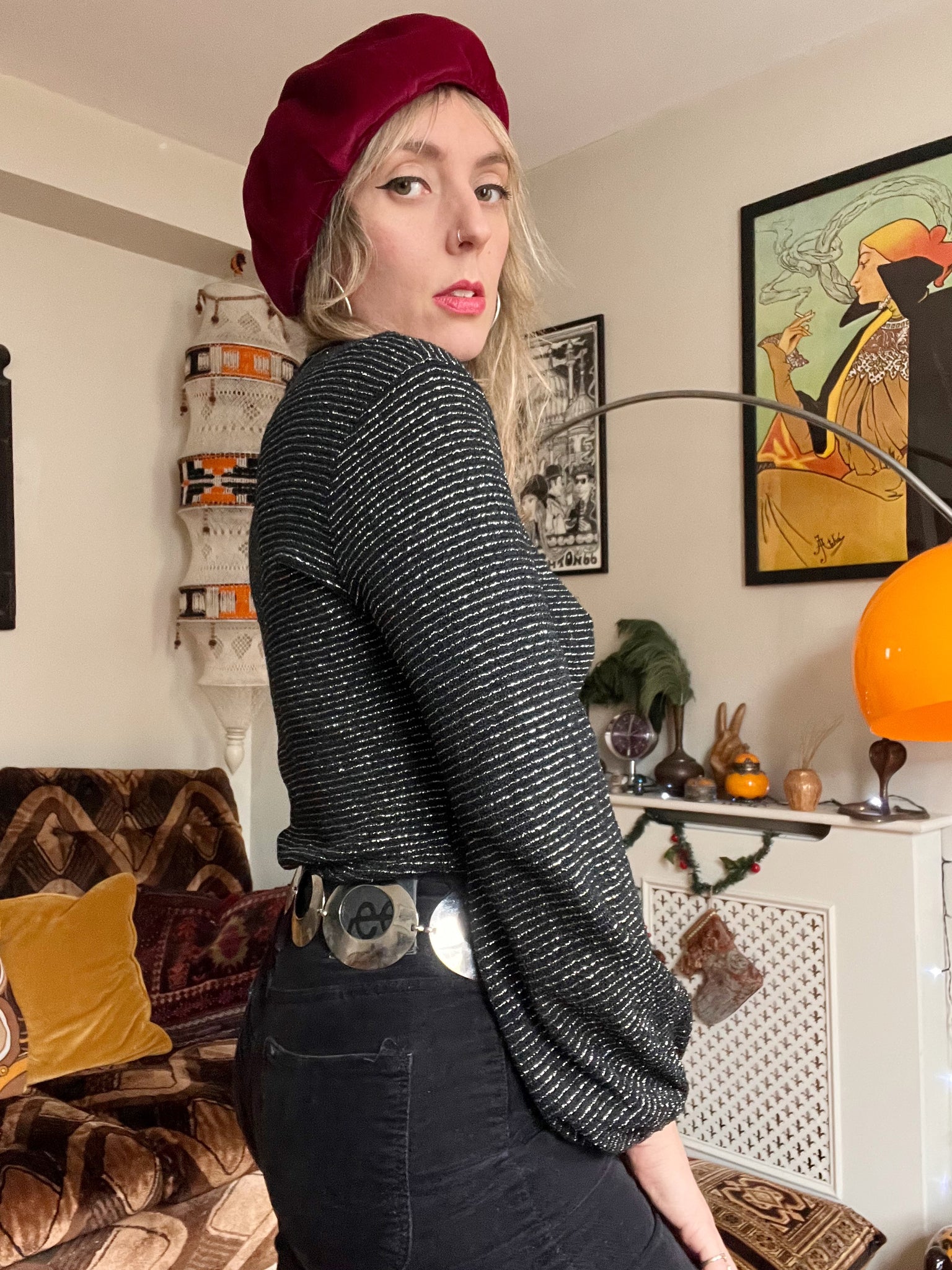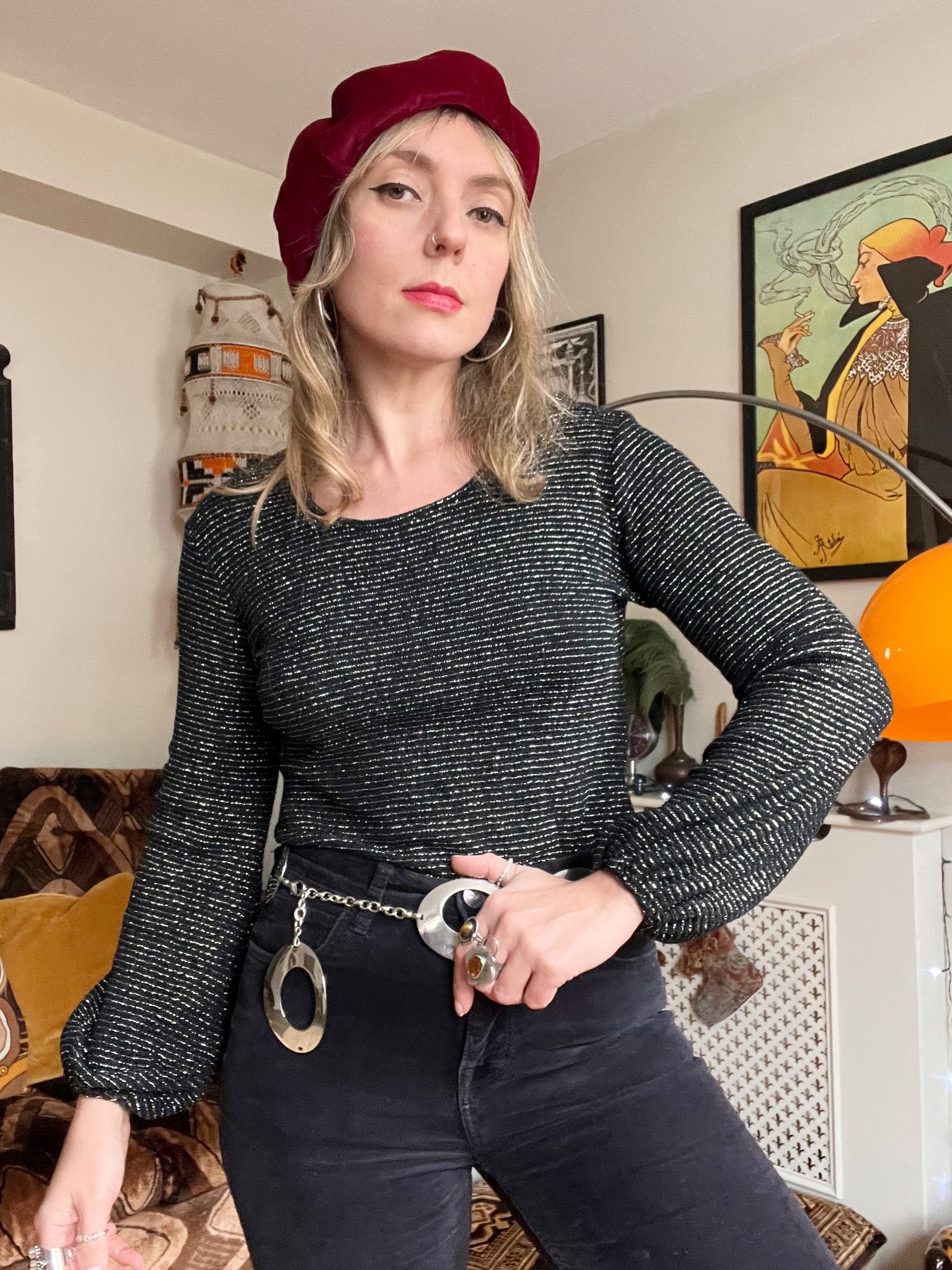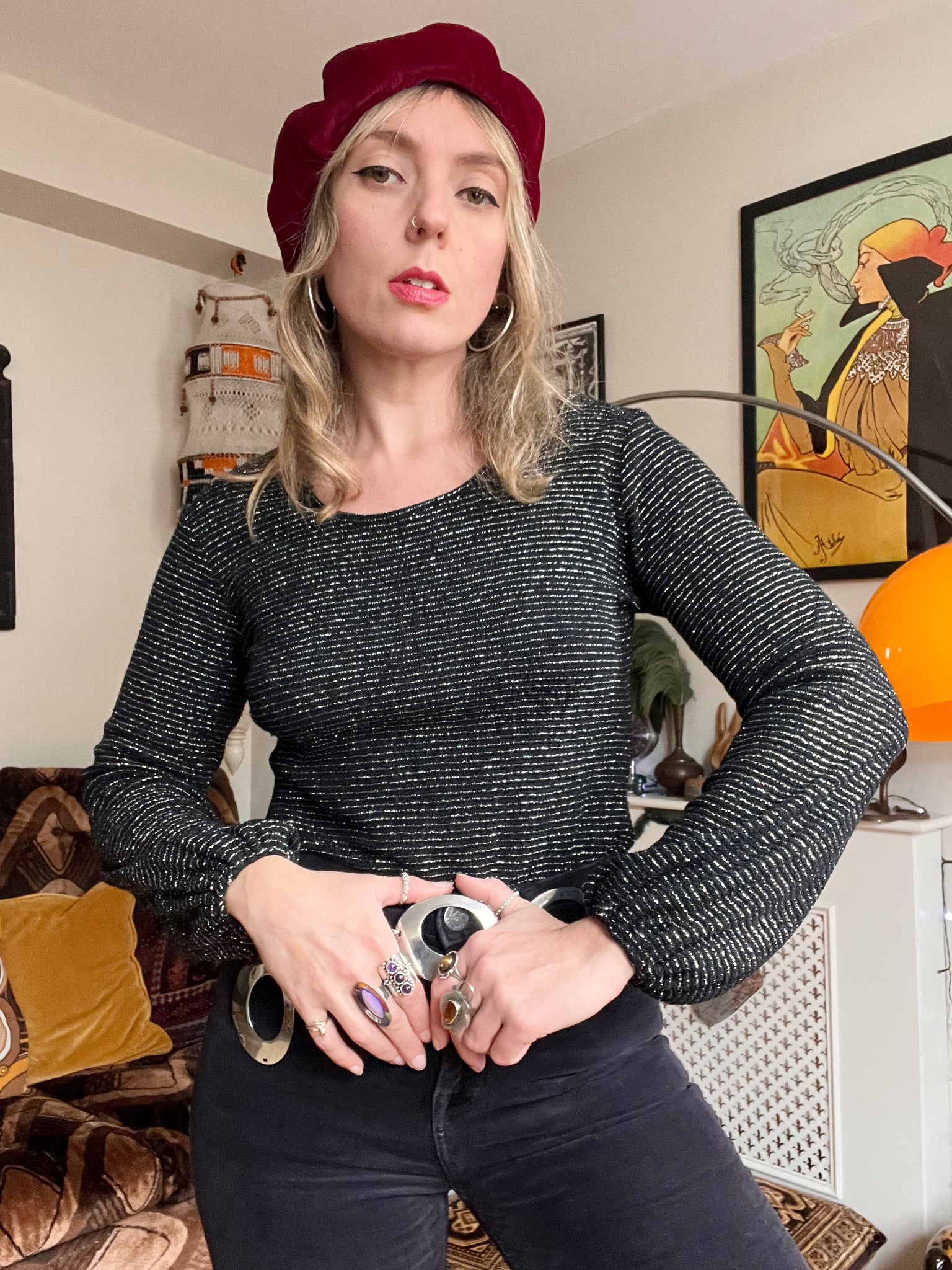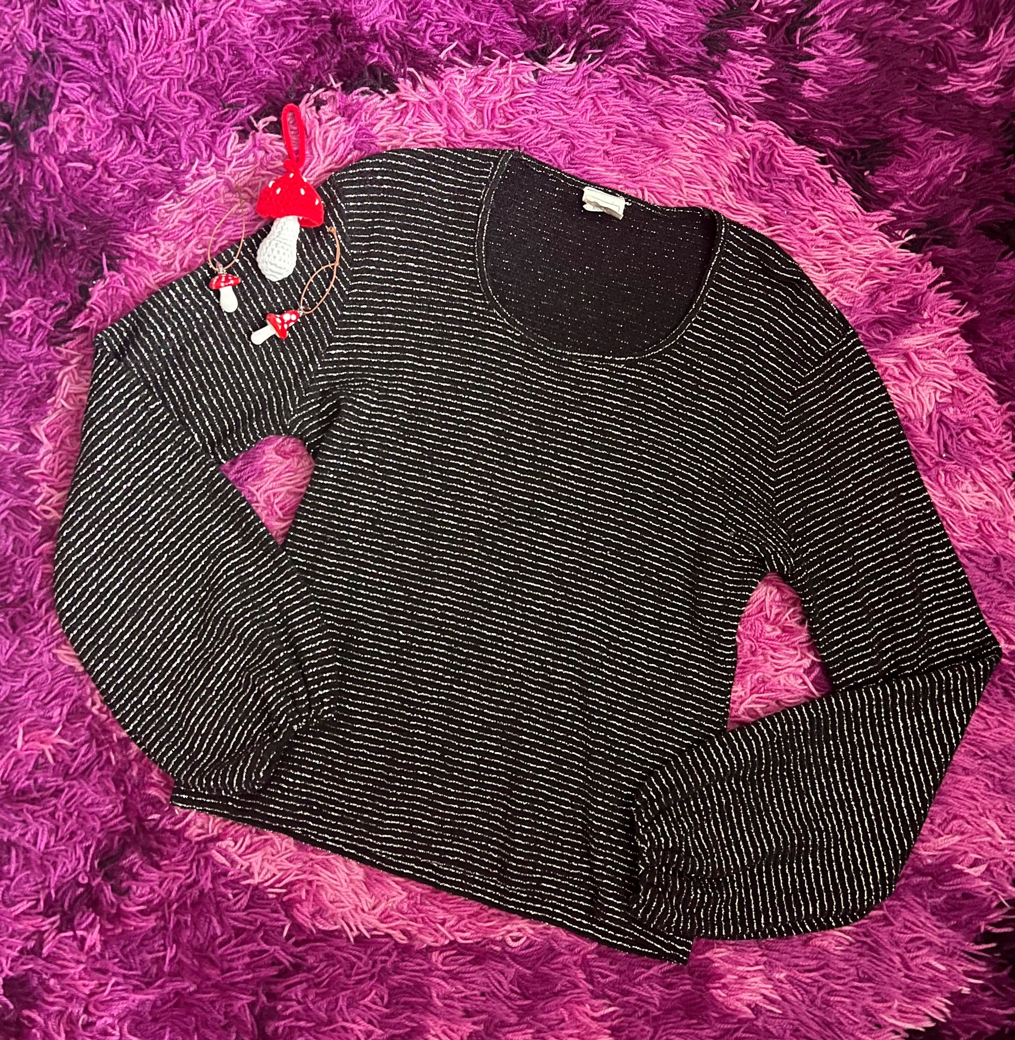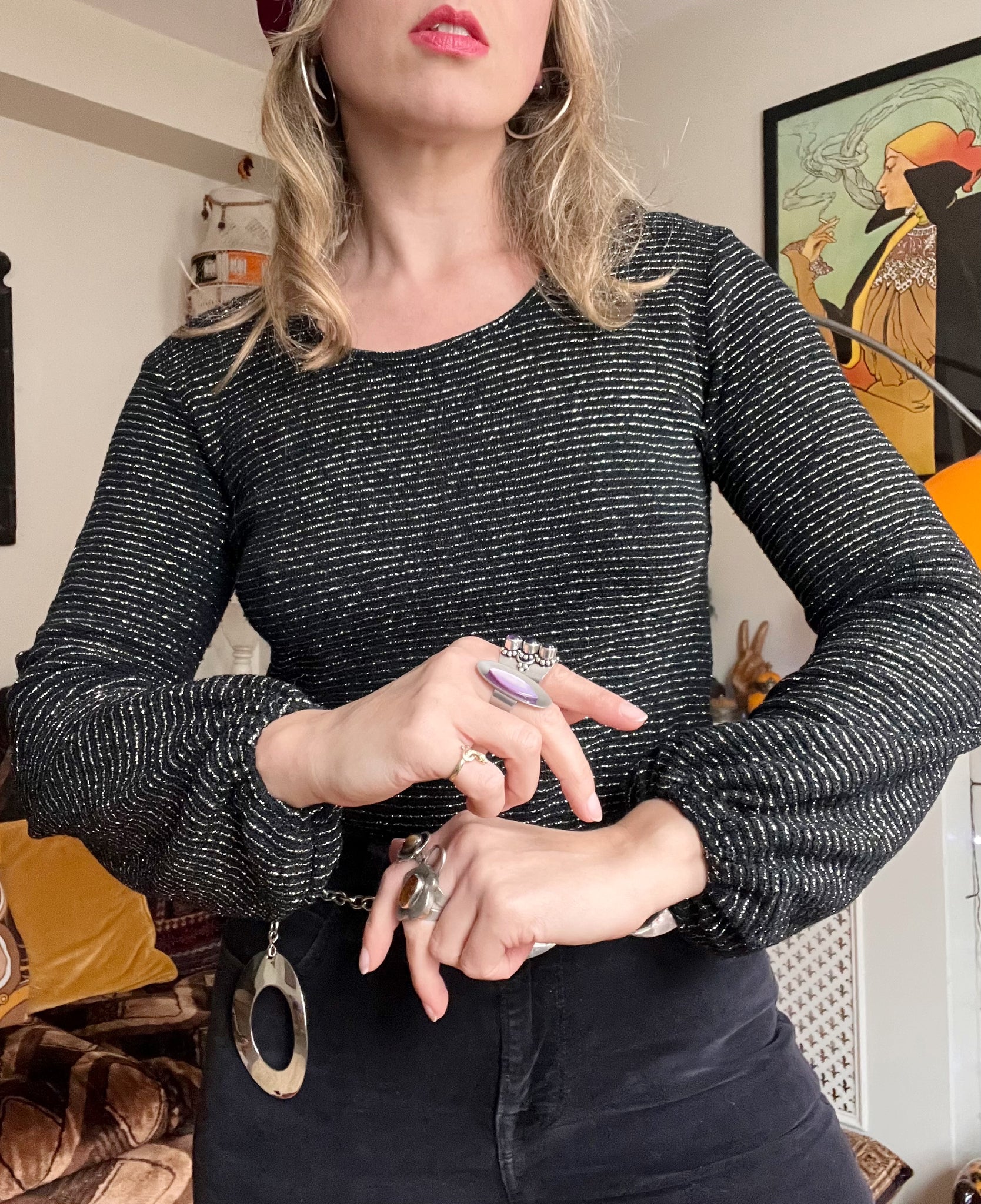 Details- 70s sparkle lurex stripe bishop sleeve top