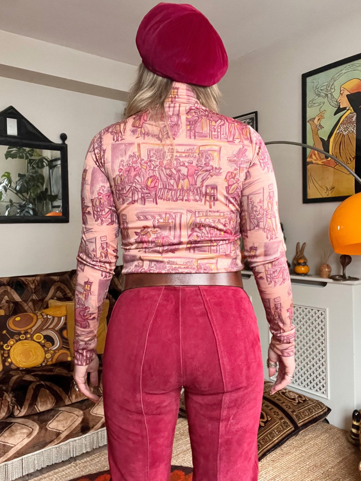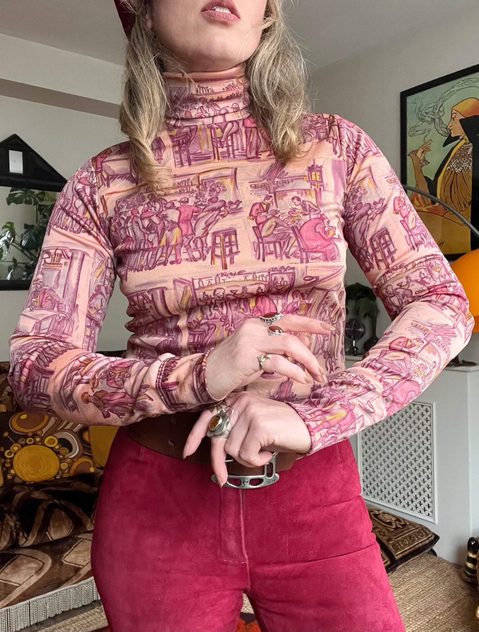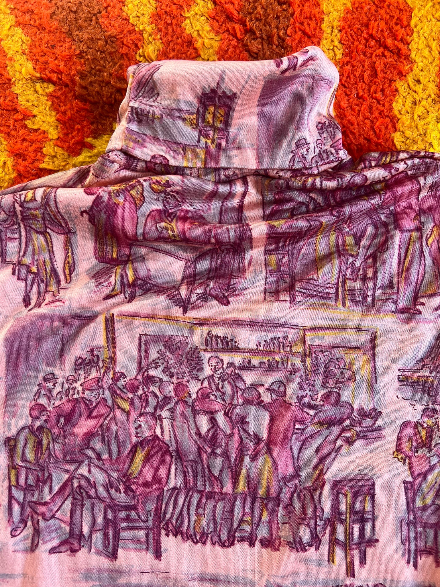 Details- 70s deadstock pink/ purple novelty deco bar scene printed roll neck top
