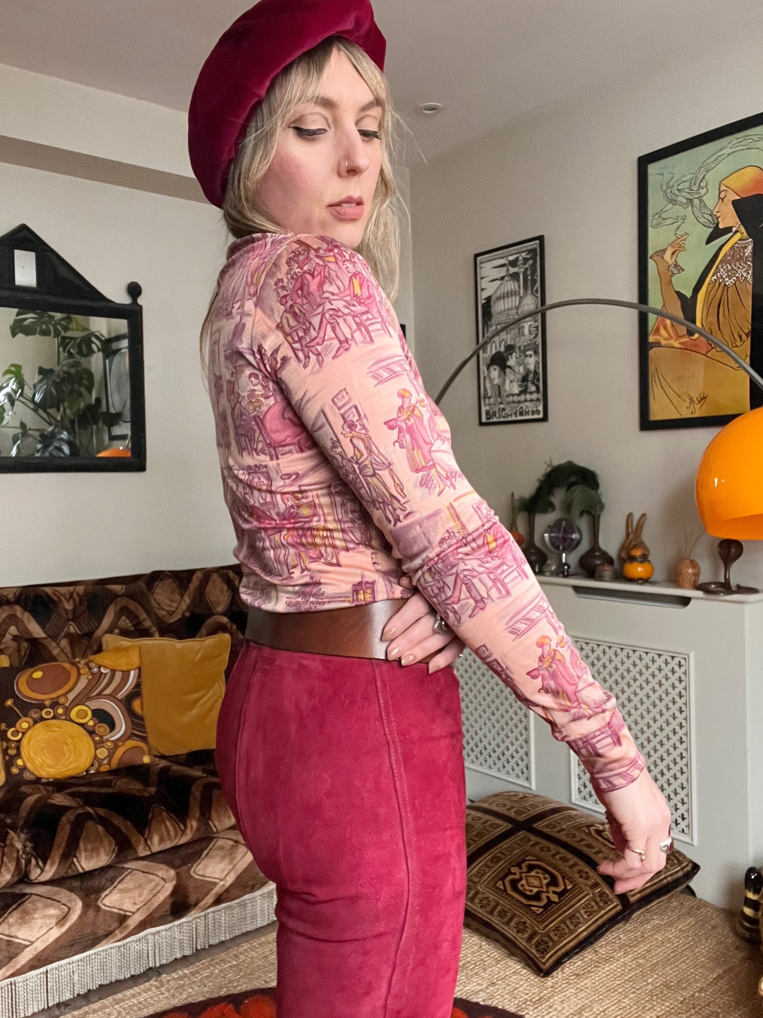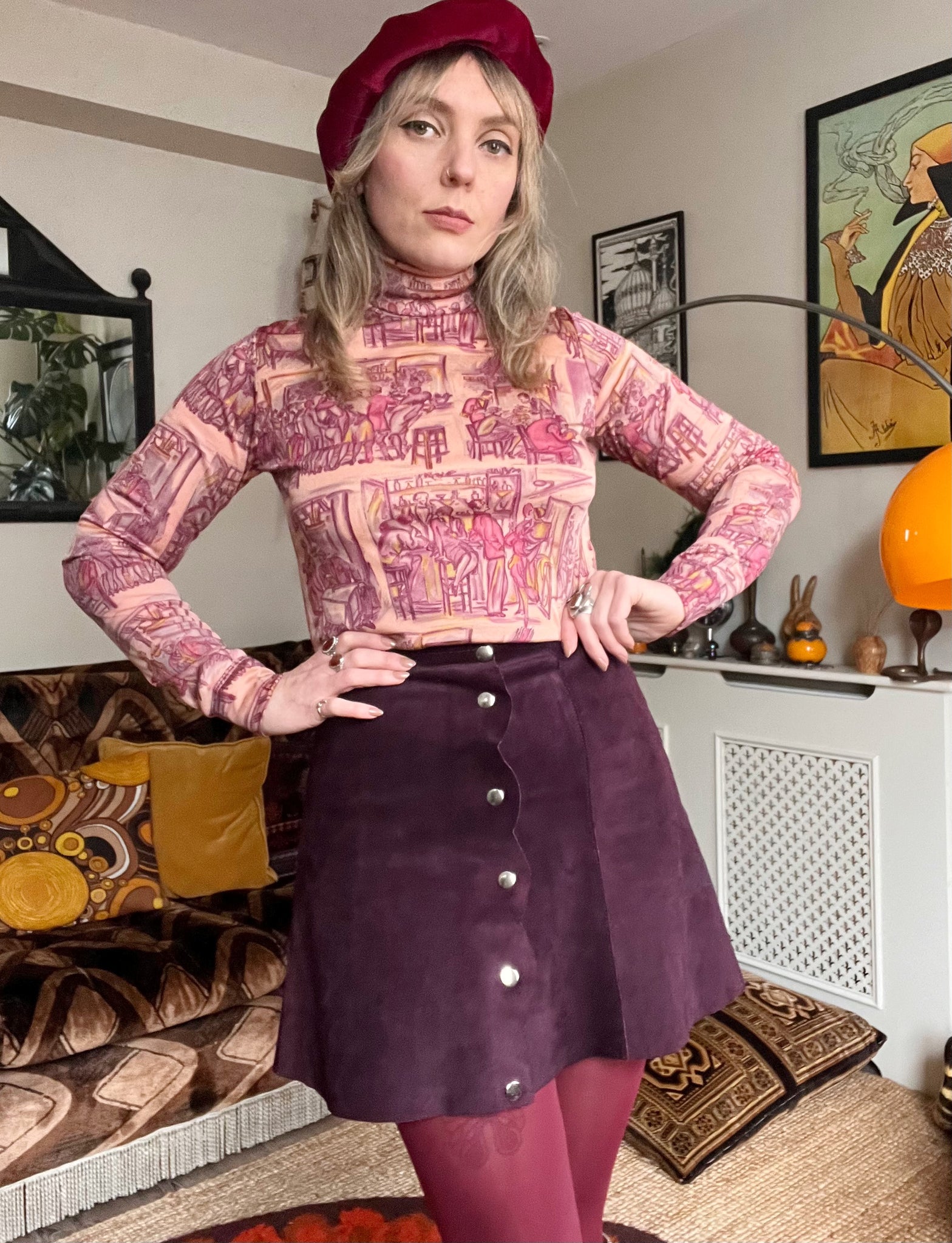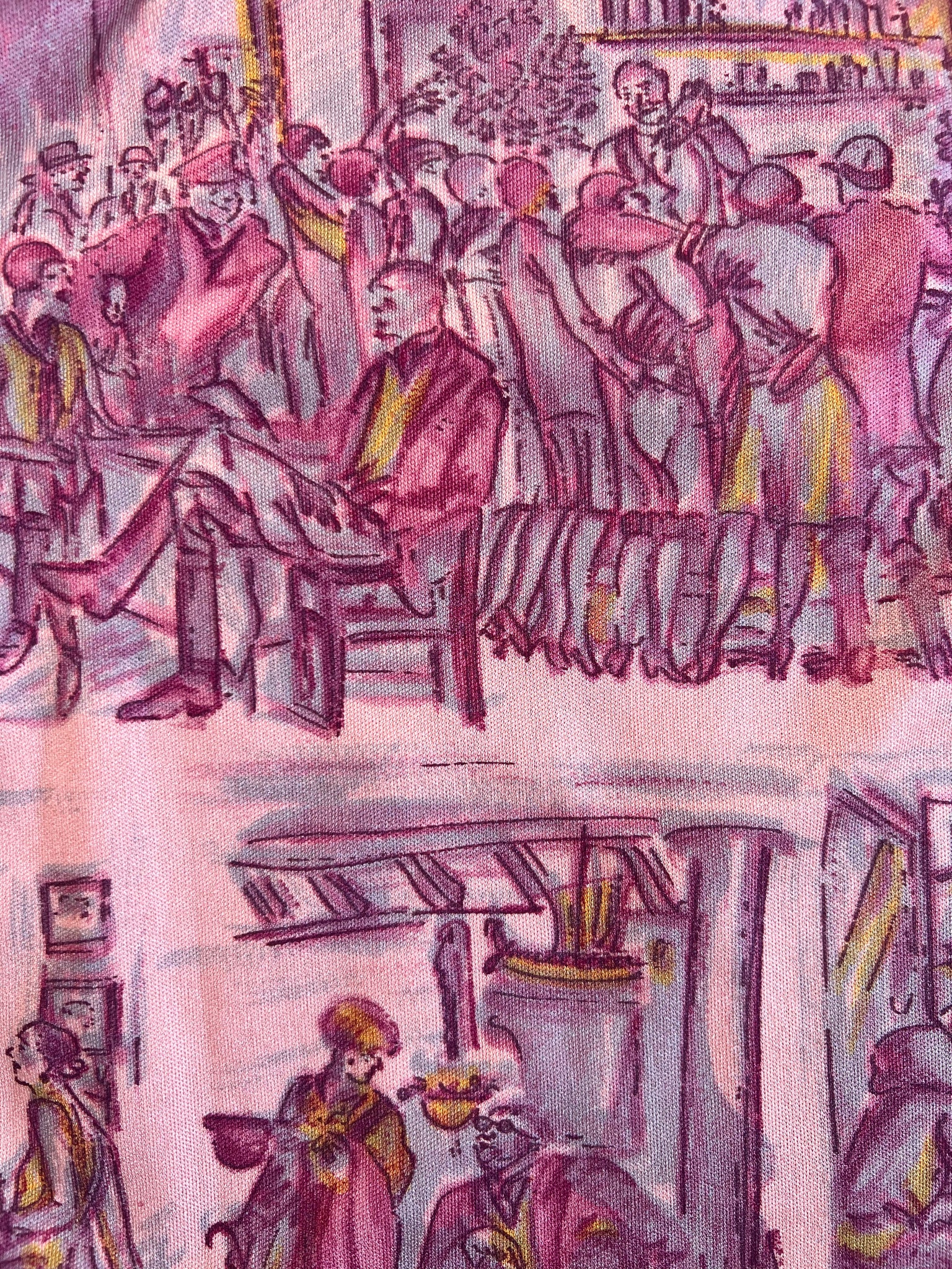 Details- 70s deadstock pink/ purple novelty deco bar scene printed roll neck top