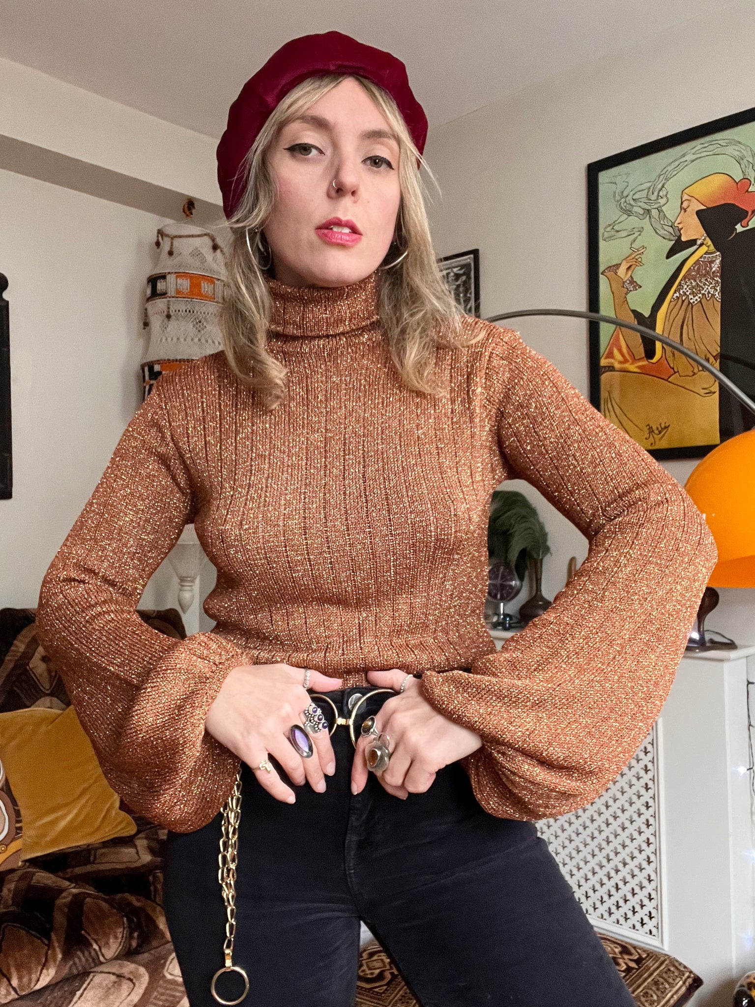 Details- 70s bronze lurex rollneck bishop sleeve jumper